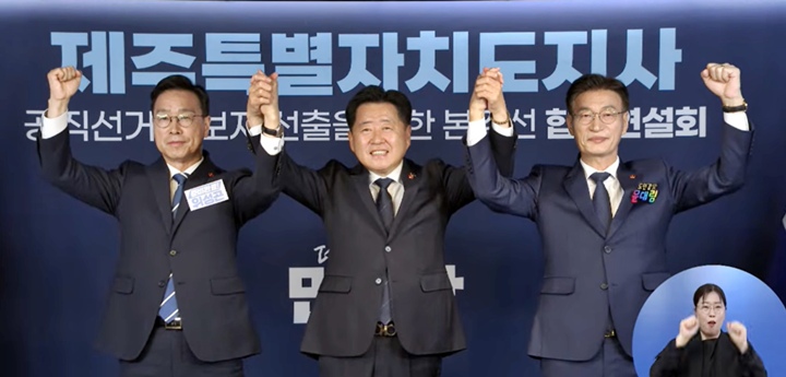 ´õºÒ¾î¹ÎÁÖ´ç Áß¾Ó´ç»ç¿¡¼ Áö³ 6ÀÏ ¿¸° Á¦9ȸ Áö¹æ¼±°Å Á¦ÁÖÁö»ç Èĺ¸ °æ¼± ÇÕµ¿¿¬¼³È¸. ¿ÞÂʺÎÅÍ ±âÈ£1¹ø À§¼º°ï, ±âÈ£2¹ø ¿À¿µÈÆ, ±âÈ£3¹ø ¹®´ë¸² Èĺ¸. µ¨¸®¹ÎÁÖTV ĸó