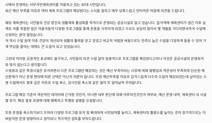 ¶Ç ´Ù¸¥ ÁֹΠB¾¾´Â ¡°°ø°øÃ¼À°½Ã¼³Àº ƯÈ÷ ÁßÀå³âÃþ¿¡°Ô º´¿ø Ä¡·á ÀÌÀü ´Ü°èÀÇ °Ç° À¯Áö ¼ö´ÜÀ¸·Î ¸Å¿ì Áß¿äÇÑ ¿ªÇÒÀ» ÇÑ´Ù¡±¸ç ¡°ÇÁ·Î±×·¥À» Àϰý ÆóÁöÇÏ´Â °ÍÀº °ø°ø±â°üÀÇ ±âº» Ã¥¹«¸¦ ½º½º·Î Ãà¼ÒÇϰí ÈѼÕÇÏ´Â °Í¡±À̶ó°í °Á¶Çß´Ù.