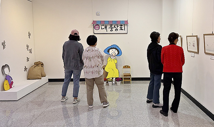 Á¦Áֱ׸²Ã¥¿¬±¸È¸ÀÇ ½ÅÀÛ '´ëdz»óȸ'´Â 1970³â´ë Á¦Áֽà ¿øµµ½É »êÁöõ ÀαÙÀ» ¹è°æÀ¸·Î ½ÒÁý °¡Á·ÀÇ ÀÏ»ó°ú ¾î¸° ½ÃÀýÀÇ ±â¾ïÀ» µû¶æÇÑ ½Ã¼±À¸·Î ´ã¾Æ³Â´Ù. ¿À´Â 30ÀϱîÁö À̾îÁö´Â À̹ø Àü½Ã¿¡´Â ±×¸²Ã¥¿¡ ¼ö·ÏµÈ ÁÖ¿ä Àå¸éÀÇ ¿øÈ¸¦ ¼±º¸À̰í ÀÖ´Ù. ±×¸²Ã¥ ¼Ó ij¸¯Å͸¦ ½ÇÁ¦ Å©±â·Î ±¸ÇöÇÑ Æ÷ÅäÁ¸µµ ¼³Ä¡Çß´Ù.