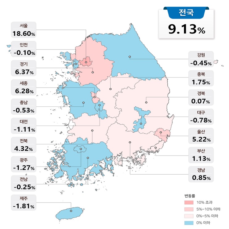 Á¦ÁÖ´Â °øµ¿ÁÖÅà °ø½Ã°¡°ÝÀÌ 1.81% ³»·Á Àü±¹¿¡¼ Ç϶ôÆøÀÌ °¡Àå ÄÇ´Ù. Àü±¹ÀûÀ¸·Î´Â 9.13% »ó½ÂÇߴµ¥, ¼¿ïÀÌ 18.60% ¿Ã¶ó ¿À¸§¼¼¸¦ ÁÖµµÇß´Ù. ÀÌ¾î °æ±â 6.37%, ¼¼Á¾ 6.28%, ¿ï»ê 5.22%, ÀüºÏ 4.32%, ÃæºÏ 1.75%, ºÎ»êÀÌ 1.13% ¿À¸¥ °ÍÀ¸·Î ³ªÅ¸³µ´Ù.