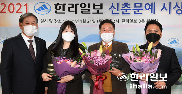 2021 ÇѶóÀϺ¸ ½ÅÃá¹®¿¹ ½Ã»ó½ÄÀÌ 21ÀÏ º»»ç ȸÀǽǿ¡¼ ¿·È´Ù. ¿ÞÂʺÎÅÍ ¼ö»óÀÚÀÎ ½ÅÀ±ÁÖ ½ÃÀÎ, ±è±ÔÇÐ ½ÃÀÎ, Â÷¿µÀÏ ¼Ò¼³°¡. »çÁø ÃÔ¿µÀ» À§ÇØ Àá½Ã ¸¶½ºÅ©¸¦ ¹þ¾ú´Ù. À̻󱹱âÀÚ