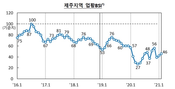 ¡¡Á¦ÁÖÁö¿ªÀÇ 2¿ù ¾÷ȲBSI´Â Àü±¹(76)º¸´Ù 30p ³·Àº ¼öÁØÀÌ´Ù. Á¦Á¶¾÷ÀÌ 27p, ºñÁ¦Á¶¾÷ÀÌ 26p ³·¾Ò´Ù.