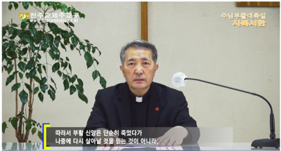 ÀÌ´Þ 4ÀÏ ºÎȰ ´ëÃàÀÏÀ» ¾ÕµÎ°í 2ÀÏ °ø°³ÇÑ »ç¸ñ¼ÇÑ¿¡¼ ¹® ±³±¸ÀåÀº "ºÎȰÀº ´Ü¼øÈ÷ 2000³â Àü °ú°Å¿¡ ¿¹¼ö´Ô²²¼ Á×À½¿¡¼ ´Ù½Ã »ì¾Æ³ª¼ÌÀ½¸¸À» ÀǹÌÇÏ´Â °ÍÀÌ ¾Æ´Ï´Ù"¶ó¸ç "ºÒÀÇ¿¡ ´ëÇÑ ÇÏ´À´Ô Á¤ÀÇÀÇ ½Â¸®, °ÅÁþ¿¡ ´ëÇÑ ÇÏ´À´Ô Áø¸®ÀÇ ½Â¸®, Á×ÀÓ¿¡ ´ëÇÑ ÇÏ´À´ÔÀÇ »ì¸®½ÉÀ¸·Î Áö±Ý ÀÌ ¼ø°£¿¡µµ ½° ¾øÀÌ ¿ª»çÇϽô ÇÏ´À´ÔÀÇ ¼Õ±æÀÌ ¹Ù·Î ºÎȰ"À̶ó°í Çß´Ù.