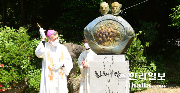 "½ÅÃà±³¾È 120ÁÖ³âÀ» ¸Â¾Æ ÂüµÈ ÈÇØ¿Í »ó»ýÀÇ ±æÀ» °É¾î°©½Ã´Ù." õÁÖ±³ Á¦ÁÖ±³±¸¿Í '½ÅÃàÇ×Àï 120Áֳ⠱â³ä»ç¾÷ȸ' °øµ¿ ¸íÀÇ·Î Á¦Áֽà ȺÏ2µ¿ Ȳ»çÆò ¹¦¿ª¿¡ ¼¼¿î 'ÈÇØÀÇ Å¾'¿¡ »õ°ÜÁø ¹®±¸´Ù. 2003³â õÁÖ±³ Á¦ÁÖ±³±¸¿Í '1901³â Á¦ÁÖÇ×Àï 100Áֳ⠱â³ä»ç¾÷ȸ'°¡ °øµ¿À¸·Î 'ÈÇØ¿Í ±â³äÀ» À§ÇÑ ¹Ì·¡ ¼±¾ð¹®'À» ¹ßÇ¥Çϸç 'ÈÇØÀÇ Å¾'À» ¼³Ä¡Çϱâ·Î Çß´ø ¾à¼ÓÀÌ 18³â ¸¸¿¡ ÀÌ·ïÁ³´Ù.