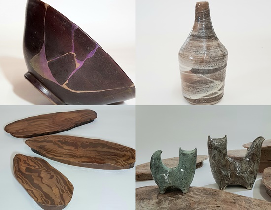 ±× Áß Çϳª°¡ ÀϺ»ÀÇ µµÀڱ⠺¹¿ø±â¼úÀ» ÀÏÄ´ 'ŲÃ÷±â'¸¦ ÀÌ¿ëÇÑ ±×¸©µéÀÌ´Ù. ÆÄ¼ÕµÈ µµÀڱ⸦ ¿ÌÀ¸·Î ºÙÀÌ°í ±Ý, Àº, ÁÖ¼® µîÀ¸·Î ¸¶°¨ÇØ Àå½ÄÇÏ´Â ÀüÅëÀûÀÎ ¼ö¸® ±â¹ý¿¡ À¯¾à µîÀ» »ç¿ëÇØ Àçź»ý½ÃŲ ±â¹°À» º¸¿©ÁØ´Ù. ÀÌ ÀÛ°¡´Â ±×°ÍµéÀ» 'ºû³ª´Â ÈäÅÍ'¶ó°í ºÒ·¶´Ù.