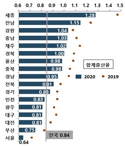 ¡¡À۳⠵µ³» ÇÕ°èÃâ»êÀ²Àº 1.02¸íÀ¸·Î 2016³â(1.43¸í) ÀÌÈÄ 5³â ¿¬¼Ó °¨¼ÒÇߴµ¥, °í·ÉÈ ¼Óµµ°¡ ºü¸¥ ¼±ÍÆ÷½Ã´Â 0.98¸íÀ¸·Î Á¦ÁÖ½Ã(1.04¸í)º¸´Ù ´õ ³·¾Ò´Ù. ÀÛ³â Àü±¹ ÇÕ°èÃâ»êÀ²Àº 0.84¸íÀ¸·Î ¿ª´ë ÃÖÀúÄ¡·Î ³ªÅ¸³µ´Âµ¥, 1¸íÀÌ ³ÑÀº Áö¿ªÀº ¼¼Á¾(1.28¸í), Àü³²(1.15¸í), °¿ø(1.04¸í), Ãæ³²(1.03¸í), Á¦ÁÖ, °æºÏ(1.0¸í) µî 17°³ ½Ãµµ Áß 6°³ ½Ãµµ·Î Áý°èµÆ´Ù.