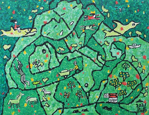 ÀüÀÛµé°ú ÀÕ´ê´Â '¾î¿ï¸²ÀÇ °ø°£' ¿¬ÀÛÀÌ ÆîÃÄÁö´Â ÀÌ Àü½Ã¿¡¼ ±è ÀÛ°¡´Â °Å´ëÇÑ ¼³¹®´ëÇÒ¸ÁÀÇ Ç° ¾È¿¡¼ ÀÚÀ¯·ÎÀÌ ³ë´Ò°í ÀÖ´Â Àΰ£°ú ¿Â°® »ý¸íüµéÀ» µ¿È ¼Ó ÆÇŸÁö·Î Ç®¾î³»°í ÀÖ´Ù. ±×µ¿¾È 7~8m Å©±âÀÇ ´ëÀÛÀ» ÅëÇØ »ý¸í¿¡ ´ëÇÑ °æ¿Ü°¨À» µå·¯³Â´Ù¸é À̹ø¿£ ÇÑÁö¿¡ ¾ÆÅ©¸±¹°°¨À¸·Î ÀÛ¾÷ÇÑ 'ÀÛÀº ±×¸²µé'·Î "¸ðµç °ÍµéÀº ´Ù »ì¾Æ°¡´Â ÀÌÀ¯°¡ ÀÖ´Ù"´Â ¸Þ½ÃÁö¸¦ µå·¯³½´Ù. ¹Ì¼úǰ ¼ÒÀåÀÇ ¹®ÅÎÀ» ³·Ãß¸ç ´õ ¸¹Àº °ü¶÷°´µé°ú ¸¸³ª°í ½ÍÀº ¹Ù¶÷µµ ´õÇØÁ³´Ù.