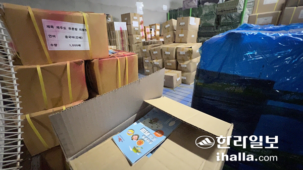 ¡¡À̳¯ ¿ÀÀü Á¦ÁÖ°ü±¤°ø»ç ¹°Ç° º¸°ü¼Ò¿¡¼´Â ÀçȰ¿ë ¾÷ü °ü°èÀÚ°¡ 1t Æ®·° ÀûÀçÇÔ¿¡ Á¦ÁÖ°ü±¤°ø»çÀÇ È«º¸¹° ¹Ú½º¸¦ ½Ç¾î ³ª¸£°í ÀÖ¾ú´Ù. ¹Ú½º¿¡´Â Á¦ÁÖ°ü±¤°ø»ç°¡ 2019³â 12¿ù Á¦ÀÛÇÑ Áß±¹¾î, ¿µ¾î ¹ø¿ªº» Á¦ÁÖ°ü±¤Áöµµ 400¿©ºÎ°¡ ´ã°Ü ÀÖ¾ú´Ù. ÇØ´ç È«º¸¹°Àº ¸ðµÎ ÀçȰ¿ë ¾÷ü¸¦ ÅëÇØ Æó±âó¸® µÇ´Â °ÍÀ¸·Î À̳¯ ÇÏ·ç Â÷·®ÀÌ ½Ç¾î³ª¸¥ ¹Ú½º¸¸ ´ë·« 150¿©°³¿¡ ´ÞÇß´Ù.