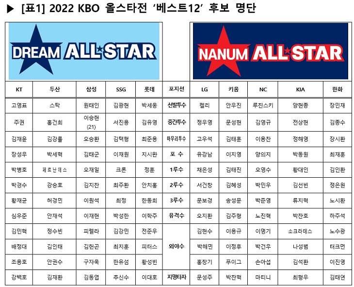 ѱξ߱ȸ 7 16 ǿ ֵǴ 2022 KBO ýŸ 帲 ýŸ(KT, λ, Z, SSG, Ե) ýŸ(LG, Ű, NC, KIA, ȭ) Ǹ, Ǻ õ ĺ 120 , 'Ʈ12' 24 Ѵٰ 2 .