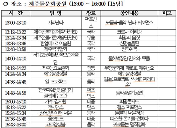 À̳¯ Á¦ÁÖµ¹¹®È°ø¿ø¿¡¼´Â ¿ÀÈÄ 1½ÃºÎÅÍ 4½Ã±îÁö Á¦ÁÖ±¹¾ÇÇùȸ, Á¦ÁÖ³ó¿äº¸Á¸È¸, ¿¡¶Ñ¿Ð¾Ó»óºí, °¡¼ö ±èÁö¿ø, ½Ì¾î¼Û¶óÀÌÅÍ ³Ê¿ï, È«Á¶¹êµå µî 15°³ÆÀÀÌ Ã⿬ÇÑ´Ù.