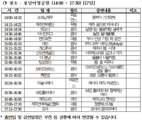 ¿ÀÈÄ 2½ÃºÎÅÍ 5½Ã30ºÐ±îÁö ¿ë´ã¾î¿µ°ø¿ø¿¡¼ ÆîÃÄÁú ¹«´ë¿¡´Â Á¦ÁÖ¿¬¹«¿ë´Ü, ¹êµå¹¦ÇÑ, ·ùÁØ¿µ, °Ô½ºÈľ¾, ºê¸®Áîºê¶ó½º, ¸¶¼ú»ç·¹ÀÌ µî 17°³ ÆÀÀÌ ¿À¸¥´Ù.