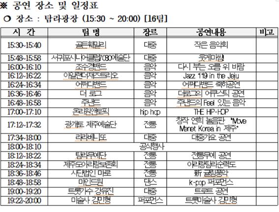 ޶ó±¤Àå¿¡¼´Â ¿ÀÈÄ 3½Ã30ºÐºÎÅÍ ¹ã 8½Ã±îÁö °ø¿¬ÀÌ ÁøÇàµÈ´Ù. °ñµçÈѹи®, ¼±ÍÆ÷½Ã´Ï¾îŬ·´7080¿¹¼ú´Ü, Á¶¼ö°æ¹êµå, ¾î¼´Ù¹êµå, ±¤°³Åä Á¦ÁÖ¿¹¼ú´Ü, Ž¶ó¹«¿¹´Ü, Á¦ÁÖµµ¾Æ¸®¶ûº¸Á¸È¸, Æ®·Ô°¡¼ö °À¯Áø µî 16°³ÆÀÀÌ ´Ùä·Ó°í dz¼ºÇÑ ¹«´ë¸¦ ²Ù¹Î´Ù.