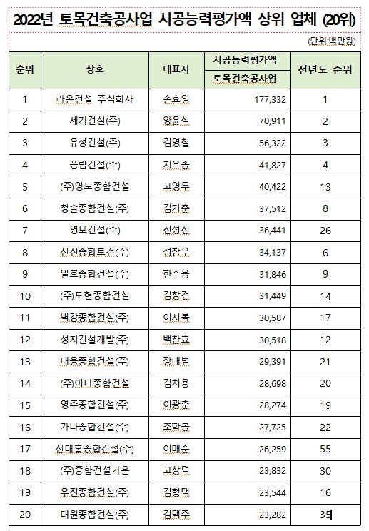 Åä¸ñ°ÇÃà°ø»ç¾÷À» º¸À¯ÇÑ ¾÷üÀÇ °ø½Ã¾×Àº ¶ó¿Â°Ç¼³(ÁÖ)°¡ 1773¾ï¿øÀ¸·Î 1À§¸¦ ±â·ÏÇß´Ù. ÀÌ¾î ¼¼±â°Ç¼³(ÁÖ)°¡ 709¾ï¿øÀ¸·Î 2À§, À¯¼º°Ç¼³(ÁÖ)°¡ 563¾ï¿øÀ¸·Î 3À§, dz¸²°Ç¼³(ÁÖ)°¡ 418¾ï¿øÀ¸·Î 4À§¸¦ ±â·ÏÇߴµ¥ 1~4À§ ¸ðµÎ Áö³ÇØ¿Í ¼øÀ§ º¯µ¿ÀÌ ¾ø¾ú´Ù.