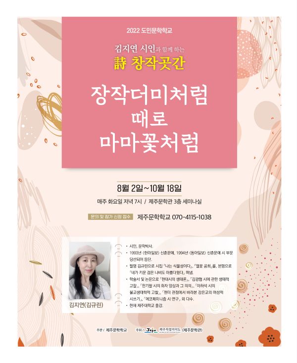 [ÇѶóÀϺ¸]Á¦ÁÖ¹®ÇÐÇб³(¿î¿µÀ§¿øÀå ¹ÚÀçÇü)´Â ±èÁö¿¬ ½ÃÀΰú ÇÔ²²ÇÏ´Â ½Ã âÀÛ°÷°£ 'ÀåÀÛ´õ¹Ìó·³ ¶§·Î ¸¶¸¶²Éó·³'À» 2ÀϺÎÅÍ 10¿ù 18ÀÏ ¸ÅÁÖ È¿äÀÏ ¿ÀÈÄ 7½Ã Á¦ÁÖ¹®Çаü ¼¼¹Ì³ª½Ç¿¡¼ ¿î¿µÇÑ´Ù.