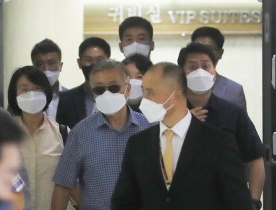 1ÀÏ ¿ÀÈÄ ¿©¸§ ÈÞ°¡Â÷ Á¦ÁÖ°øÇ׿¡ µµÂøÇÑ ¹®ÀçÀÎ Àü ´ëÅë·É°ú ºÎÀÎ ±èÁ¤¼÷ ¿©»ç. ¹® Àü ´ëÅë·ÉÀº 1ÁÖÀϰ£ Á¦ÁÖ¿¡ ¸Ó¹°¸ç ÈÞ¾çÇÒ ¿¹Á¤ÀÎ °ÍÀ¸·Î ¾Ë·ÁÁ³´Ù.¿¬ÇÕ´º½º