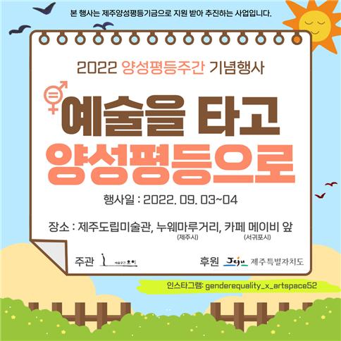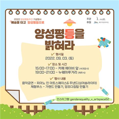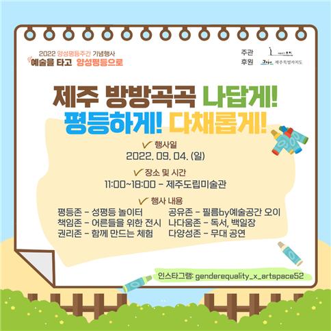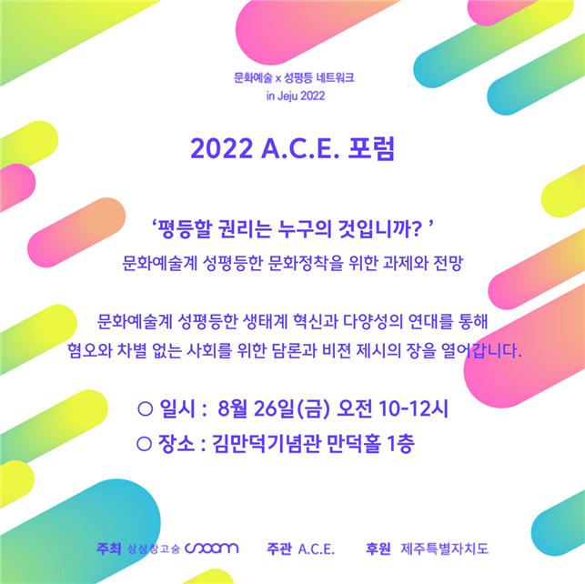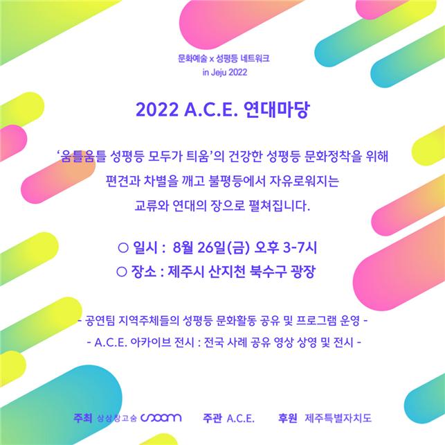º°°³·Î ¿À´Â 25Àϰú 26ÀÏ¿£ ¹®È¿¹¼ú°è »ýÆòµî ¹®È È®»êÀ» À§ÇÑ 'A.C.E.¿¹¼úÁ¦°¡ °³ÃֵȴÙ. Á¦ÁÖÀÚÄ¡µµÀÇ '2022 ¹®È¿¹¼ú¡¿¼ºÆòµî ³×Æ®¿öÅ© ÀÎ Á¦ÁÖ(in Jeju)' »ç¾÷ÀÇ ÀÏȯÀ¸·Î, »ó»óâ°í ¼û(´ëÇ¥ ¹ÚÁøÈñ)ÀÌ ÁÖÃÖÇÏ´Â Çà»ç´Ù. ¿¹¼úÁ¦´Â '¿òƲ¿òƲ ¼ºÆòµî ¸ðµÎ°¡ Æ·¿ò'À» ÁÖÁ¦·Î 25ÀÏ 'Á¦ÁÖ¿©¼ºÀÇ »î-ªÀº±âÇà'°ú 26ÀÏ '2022 A.C.E. Æ÷·³' ¹× '2022 A.C.E. ¿¬´ë¸¶´ç' ÇÁ·Î±×·¥À¸·Î ±¸¼º¡¤¿î¿µµÈ´Ù.