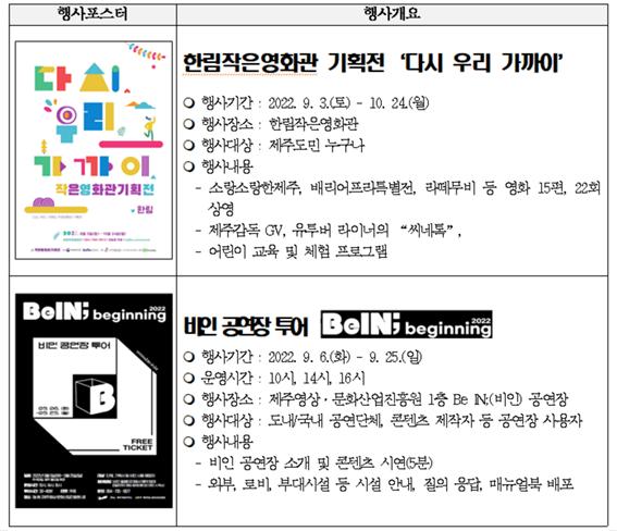 9¿ù 6ÀϺÎÅÍ 25ÀϱîÁö °ø¿¬ÀåÀ» ¼Ò°³Çϱâ À§ÇÑ µµ³»¡¤¿Ü °ø¿¬°ü°èÀÚ¸¦ ´ë»óÀ¸·Î ºñÀÎ °ø¿¬Àå Åõ¾î ÇÁ·Î±×·¥À» ÁøÇàÇϰí, ÀÌÈÄ ÁøÈï¿ø »ç¾÷°ú ¿¬°èÇØ 9¿ù 30ÀÏ Á¦ÁÖÀ½¾ÇâÀÛ¼ÒÀÇ '2022 JEJU MUSIC WEEKEND'°¡, 10¿ù 15ÀϺÎÅÍ´Â Á¦ÁÖ Áö¿ªÆ¯ÈÄÜÅÙÃ÷ °³¹ßÁö¿ø»ç¾÷À¸·Î Á¦ÀÛµÈ ½Ç°¨°ø¿¬ '±×¸²Ã¥ ¼Ó Á¦ÁÖÀ̾߱â'°¡ ¿¹Á¤µÅ ÀÖ´Ù.