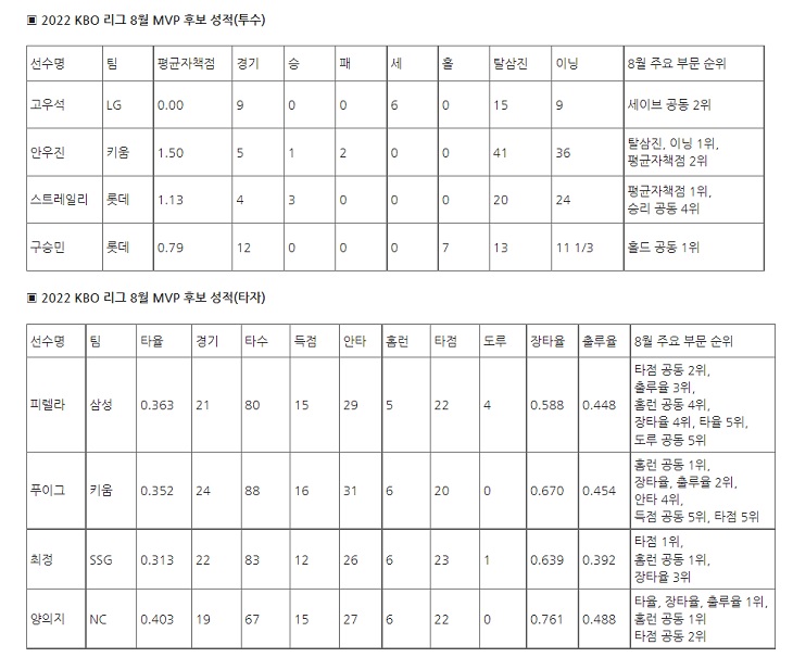 [ѶϺ] KBO 2022 SOL KBO 8 MVP ĺ 2 ߴ. 켮(LG) , ȿ(Ű), Ʈϸ, ¹(̻ Ե), Ÿڴ Ƿ(Z), Ǫ̱(Ű), (SSG), (NC) 8̴.