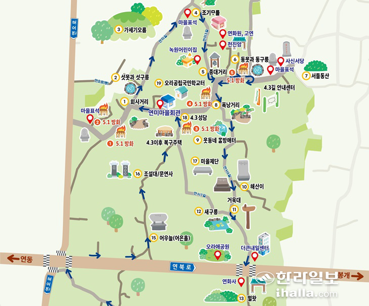 ¿¬¹Ì¸¶À»È¸(ȸÀå ¹Ú¿¬È£)¿Í ¿¬¹Ì¹®È¸¶À»»ç¾÷ÃßÁøÀ§¿øÈ¸(À§¿øÀå ¾çÀÓ¼º)°¡ ÇÔ²² ¸¸µç ¿¬¹Ì¹Ú¹°°ü±æÀº ¸¶À» ¸í¼Ò 24°³¼Ò¸¦ 1½Ã°£¿¡ °ÉÃÄ µ¹¾Æº¼ ¼ö Àִ Ž¹æ·Î´Ù. ÃÖ±Ù¿£ QRÄڵ带 Ȱ¿ëÇÑ ¾È³»Ç¥ÁöÆÇÀ» Ãß°¡·Î ¼³Ä¡ÇØ ¹æ¹®°´µéÀÌ ÇØ¼³»ç ¾øÀ̵µ °¢°¢ÀÇ ¸í¼Ò¿¡ ¾ôÈù »ó¼¼ÇÑ Á¤º¸¸¦ ¾òÀ» ¼ö ÀÖµµ·Ï Çß´Ù. QRÄڵ带 ÂïÀ¸¸é ¾ÆÄ«À̺êÇüÀ¸·Î ±¸ÃàµÈ '¿¬¹Ì¹®È¸¶À»' ȨÆäÀÌÁö·Î ¿¬°áµÅ ÇØ´ç ¸í¼Ò¿¡ ´ëÇÑ ÁֹΠÀÎÅͺä, °í¹®¼, ¿¾ »çÁø ÀÚ·á µîÀ» º¼ ¼ö ÀÖ´Ù. ¸¶À»È¸¿¡¼´Â ¿¬¹Ì¹Ú¹°°ü±æ Ž¹æ°´À» À§ÇØ Áֹεé·Î ÀÌ·ïÁø ¸¶À»¹®ÈÇØ¼³»çµµ ¿î¿µÇÑ´Ù.