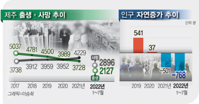 ÀÌó·³ Ãâ»ý¾Æ ¼ö°¡ °¨¼ÒÇÑ ¹Ý¸é »ç¸ÁÀÚ ¼ö´Â Áõ°¡ÇÏ¸é¼ Á¦ÁÖ´Â Áö³ÇØ Ã³À½À¸·Î Àα¸°¡ 501¸í ÀÚ¿¬°¨¼ÒÇß´Ù. ¿ÃÇØ´Â ±× ±Ô¸ð°¡ ´õ È®´ëµÅ 7¿ù±îÁö 768¸íÀÌ ÀÚ¿¬°¨¼ÒÇØ 2³â ¿¬¼Ó ÀÚ¿¬°¨¼Ò°¡ È®½Ç½ÃµÇ°í ÀÖ´Ù. Àα¸ ÀÚ¿¬Áõ°¡ ±Ô¸ð´Â 2017³â¸¸ ÇØµµ 1299¸íÀ̾úÀ¸³ª 2021³â¿£ 37¸íÀ¸·Î ÁÙ¾ú°í Áö³ÇØ¿¡´Â ÀÚ¿¬°¨¼Ò·Î µ¹¾Æ¼¹´Ù.