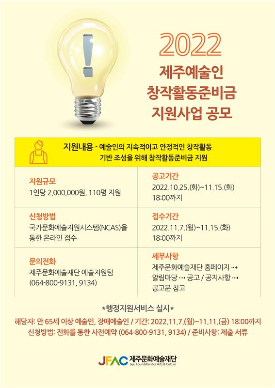 À̹ø Á¦ÁÖ¿¹¼úÀΠâÀÛÁغñ±Ý Áö¿ø»ç¾÷Àº Äڷγª19·Î ÀÎÇÑ ¿¹¼ú»ýŰè À§±â¸¦ ±Øº¹Çϰí, Áö¼Ó°¡´ÉÇÑ ¿¹¼ú âÀÛÀ» µ½±â À§ÇÑ °ÍÀÌ´Ù. º°µµÀÇ »ç¾÷ºñ Á¤»ê ÀýÂ÷ ¾øÀÌ ¿¹¼ú Ȱµ¿ º¸°í¼¸¸ Á¦ÃâÇÏ¸é µÈ´Ù.