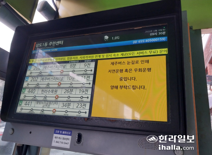 | 18ÀÏ Á¦Áֽà »ïµµ1µ¿Áֹμ¾ÅÍ ¹ö½ºÁ¤·ù¼Ò¿¡ ¼³Ä¡µÈ ¾È³» ȸ鿡 ¹ö½º°¡ '´«±æ·Î ÀÎÇØ Áö¿¬¿îÇà ȤÀº ¿ìȸ¿îÇà Áß'À̶ó´Â ¾È³»°¡ ³ª¿À°í ÀÖ´Ù. |