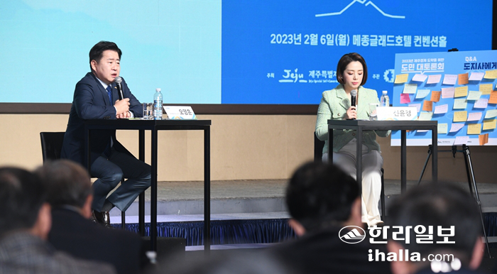 Á¦ÁÖ»ó°øÈ¸ÀǼҰ¡ ÁÖ°üÇÑ '2023³â Á¦ÁÖ°æÁ¦ µµ¾àÀ» À§ÇÑ µµ¹Î´ëÅä·Ðȸ'°¡ 6ÀÏ ¿ÀÈÄ ¸ÞÁ¾±Û·¡µåÈ£ÅÚ¿¡¼ 'À§±â¸¦ ³Ñ¾î µµ¾àÇϴ ưưÇÑ Á¦ÁÖ°æÁ¦'¸¦ ´ëÁÖÁ¦·Î ¿·È´Ù. À̻󱹱âÀÚ