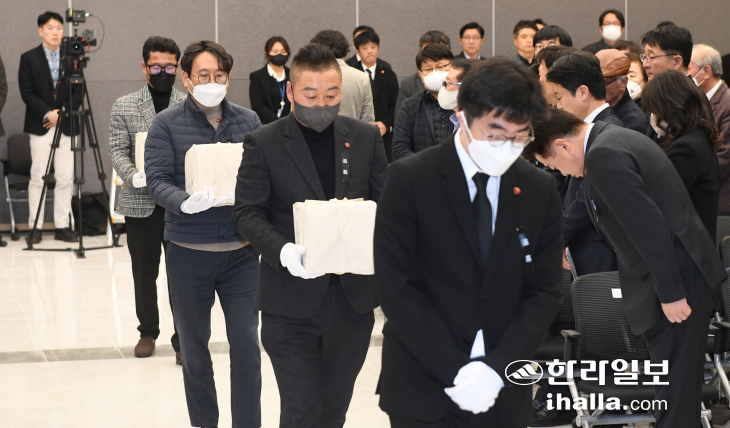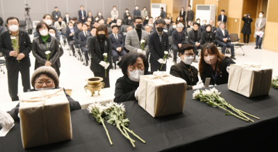 28ÀÏ Á¦ÁÖ4¡¤3Æòȱ³À°¼¾ÅÍ¿¡¼ ¿¸° '4¡¤3Èñ»ýÀÚ À¯ÇØ ½Å¿øÈ®ÀÎ º¸°íȸ'¿¡¼ ½Å¿øÀÌ È®ÀÎµÈ Èñ»ýÀÚ ±èÄ¥±Ô, °Ã¢±Ù, ±èµÎ¿Á ¾¾ÀÇ À¯Á·µéÀÌ À¯°ñÇÔÀ» ¸¶ÁÖÇÏ¸ç ´«¹° Áþ°í ÀÖ´Ù. À̻󱹱âÀÚ