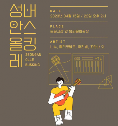 À̹ø °Å¸® °ø¿¬Àº Áö³´Þ 19Àϰú 26ÀÏ »êÁöµî´ë¿¡¼ ½Ã¹ü ¿î¿µÀÌ ÀÌ·ïÁ³´Ù. 4¿ù¿¡´Â ÀÌ´Þ 15Àϰú 22ÀÏ ¿ÀÈÄ 2½Ã µ¿¹®½ÃÀå ¾Õ Å½¶ó¹®È±¤Àå¿¡¼ ¹ö½ºÅ·À» À̾´Ù. Ã⿬ÁøÀº ´Ï´©, ¸Þ¸®ÄÚ¹ßÆ®, ¾îÁøº°, Á¶¾È³ª µîÀÌ´Ù.