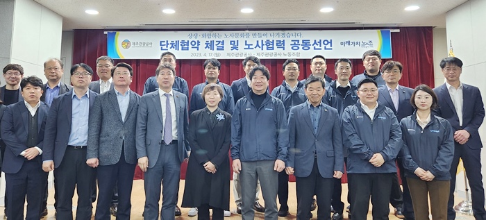 Á¦ÁÖ°ü±¤°ø»ç(»çÀå °íÀº¼÷)Àº Á¦ÁÖ°ü±¤°ø»ç ¹Ì·¡°¡Ä¡³ëµ¿Á¶ÇÕ(À§¿øÀå À̽Âö)°ú Áö¹æ³ëµ¿À§¿øÈ¸ Á¶Á¤±îÁö °¡´Â ÁøÅ볡¿¡ ´ÜüÇù¾à¿¡ ÇÕÀÇÇϰí 17ÀÏ ³ë»çÇù·Â¼±¾ð½ÄÀ» °³ÃÖÇß´Ù.