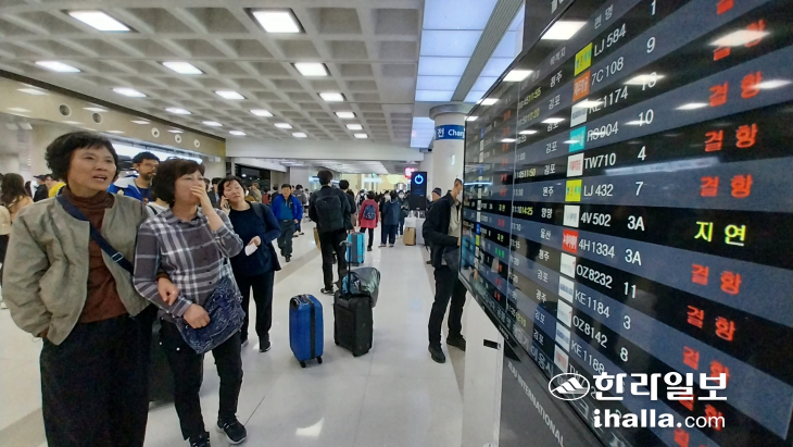 ÀÌ·ÎÀÎÇØ Á¦ÁÖ°øÇ׿¡µµ ±Þº¯Ç³Æ¯º¸¿Í °Ç³Æ¯º¸°¡ ³»·ÁÁö¸é¼ 18ÀÏ ¿ÀÀü 10½Ã30ºÐ ±âÁØ Ãâ¹ß 71Æí, µµÂø 74Æí µî ±¹³»¼± Ç×°øÆí 145ÆíÀÌ °áÇ×Ç߰ųª »çÀü °áÇ×Çß´Ù. ÀÌ·ÎÀÎÇØ Á¦ÁÖ°øÇ×Àº ´ëü Ç×°øÆíÀ» ±¸ÇÏ·Á´Â ¿©Çà°´µé·Î Å©°Ô ºÕºñ°í ÀÖ´Ù.