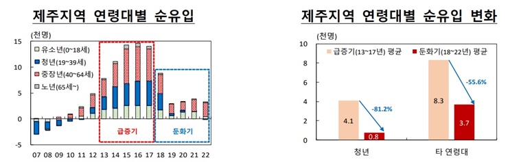 ¼¼¹Ì³ª¿¡¼ ¹Úµ¿ÁØ Çѱ¹ÀºÇà Á¦ÁÖº»ºÎ °æÁ¦Á¶»çÆÀÀåÀÇ 'ÃÖ±Ù Á¦ÁÖÁö¿ª û³âÀα¸ ¼øÀ¯Ãâ ¿äÀÎ ¹× ½Ã»çÁ¡' ÁÖÁ¦¹ßÇ¥¿¡ µû¸£¸é Á¦ÁÖ ¼øÀ¯ÀÔ(ÀüÀÔ-ÀüÃâ) Àα¸°¡ ±ÞÁõÇß´ø 2017³â 4801¸íÀÌ ¼øÀ¯ÀԵƴø û³âÀα¸´Â 2018³âºÎÅÍ µÐȵDZ⠽ÃÀÛÇØ 2022³â 142¸í ¼øÀ¯Ãâ·Î ÀüȯÇß´Ù. ¿ÃÇØ µé¾î¼´Â 1ºÐ±â±îÁö 653¸íÀÌ ¼øÀ¯ÃâµÆ´Ù. ÀÌ¿¡ µû¶ó 2018³â 17¸¸8000¸íÀÌ´ø û³âÀα¸´Â Áö³ÇØ 16¸¸4000¸íÀ¸·Î ÁÙ¸é¼ ÀüüÀα¸¿¡¼ Â÷ÁöÇÏ´Â ºñÁßµµ 26.6%¿¡¼ 24.2%·Î °¨¼ÒÇß´Ù.