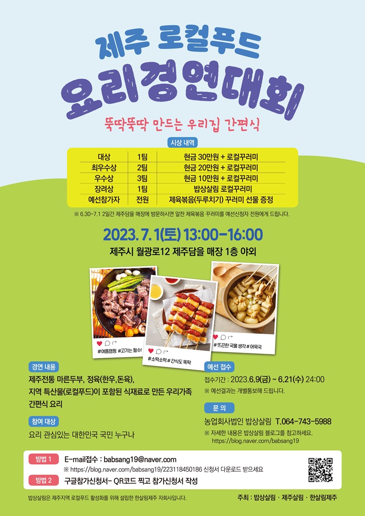 [ÇѶóÀϺ¸]»çȸÀû±â¾÷ ¹ä»ó»ì¸²(ÁÖ)¿Í Á¦Áֻ츲, Çѻ츲Á¦ÁÖ°¡ Á¦ÁÖÀüÅë ¸¶¸¥µÎºÎ¿Í Áö¿ªÆ¯»ê¹°(·ÎÄÃǪµå)À» ¾Ë¸®°í °Ç°ÇÑ ¹ä»óÀÇ Çູ°ú Áö¿ª¸Ô°Å¸® »ý»ê¡¤¼Òºñ °¡Ä¡ °øÀ¯¸¦ À§ÇÑ '¶Òµü¶Òµü ¸¸µå´Â ¿ì¸®Áý °£Æí½Ä »Ë³»±â ¿ä¸®°æ¿¬´ëȸ'¸¦ 7¿ù 1ÀÏ °³ÃÖÇÑ´Ù°í ¹àÇû´Ù. Àå¼Ò´Â Á¦Áֽà ¿ù±¤·Î ¼ÒÀç Á¦ÁÖ´ãÀ»¸ÅÀå 1Ãþ(¿ÀÈÄ 1~4½Ã)ÀÌ´Ù.