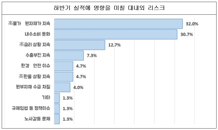 Á¶»ç¿¡¼ ÇϹݱ⠽ÇÀû¿¡ ¿µÇâÀ» ¹ÌÄ¥ ´ë³»¿Ü ¸®½ºÅ©¸¦ ¹¯´Â Áú¹®¿¡´Â '°í¹°°¡ ¿øÀÚÀç°¡ Áö¼Ó'(32.0%)°ú '³»¼ö¼Òºñ µÐÈ'(30.7%)¸¦ °¡Àå ¸¹ÀÌ ²Å¾Ò´Ù. À̾î '°í±Ý¸® »óȲ Áö¼Ó'(12.7%), '¼öÃâºÎÁø Áö¼Ó'(7.3%), 'ȯ°æ¾ÈÀü À̽´'(4.7%), '°íȯÀ² »óȲ Áö¼Ó'(4.7%), '¿øºÎÀÚÀç ¼ö±Þ Â÷Áú'(4.0%), '±âŸ'(1.3%), '±ÔÁ¦ÀÔ¹ý µî Á¤Ã¥À̽´'(1.3%), '³ë»ç°¥µî ¹®Á¦'(1.3%) ¼øÀ¸·Î ÀÀ´äÇß´Ù.
