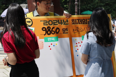 19ÀÏ ¿ÀÈÄ ¼¿ï Á¾·Î±¸ ¸¶·Î´Ï¿¡°ø¿ø¿¡¼ ½Ã¹ÎµéÀÌ À̳¯ ¿ÀÀü °áÁ¤µÈ ÃÖÀúÀӱݿ¡ °üÇÑ ÀǰßÀ» ¹¯´Â ½ºÆ¼Ä¿ ¼³¹®¿¡ Âü¿©Çϰí ÀÖ´Ù. ÃÖÀúÀÓ±ÝÀ§¿øÈ¸´Â ³»³âµµ ÃÖÀúÀÓ±ÝÀ» ¿ÃÇØ(9õ620¿ø)º¸´Ù 2.5% ÀλóµÈ 9õ860¿øÀ¸·Î °áÁ¤Çß´Ù. ¿¬ÇÕ´º½º