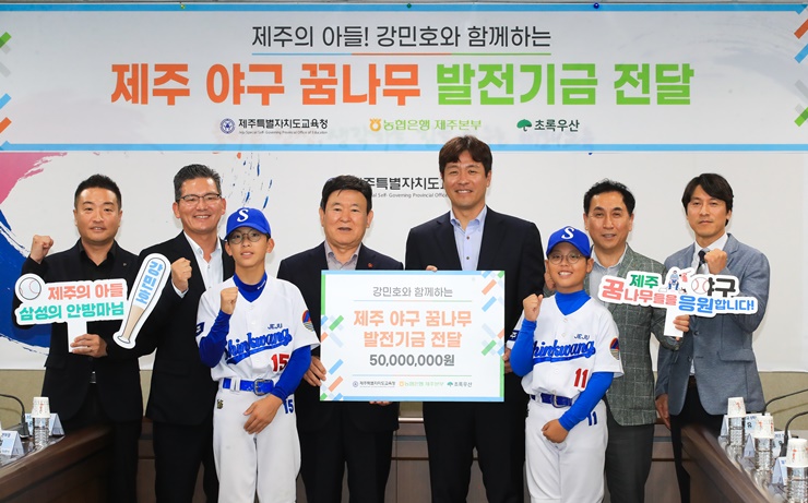 Á¦ÁÖ Ãâ½Å ÇÁ·Î¾ß±¸ ¼±¼ö °¹ÎÈ£°¡ 14ÀÏ Á¦ÁÖµµ±³À°Ã»À» ¹æ¹®ÇØ ³óÇùÀºÇà Á¦ÁÖº»ºÎ¿Í ÇÔ²² Á¶¼ºÇÑ ¾ß±¸ ²Þ³ª¹« ¹ßÀü±â±Ý 5000¸¸¿øÀ» Àü´ÞÇß´Ù. |