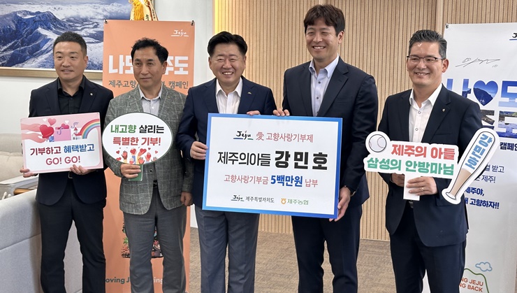 Á¦ÁÖ Ãâ½Å ÇÁ·Î¾ß±¸ ¼±¼ö °¹ÎÈ£°¡ 14ÀÏ Á¦ÁÖµµ¸¦ ¹æ¹®ÇØ °íÇâ»ç¶û±âºÎ±ÝÀ» Àü´ÞÇß´Ù. Á¦ÁÖ³óÇù Á¦°ø