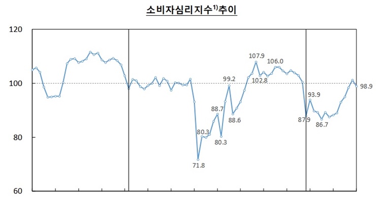[ÇѶóÀϺ¸] ȸº¹µÇ³ª ½Í´ø Á¦ÁÖÁö¿ª ¼ÒºñÀڽɸ®Áö¼ö°¡ 8°³¿ù¸¸¿¡ Ç϶ô ÀüȯÇÏ¸ç ±âÁØÄ¡(100) ¾Æ·¡·Î ¶³¾îÁ³´Ù. ¿©ÀüÈ÷ ³ôÀº ¼öÁØÀÇ ±Ý¸®¿Í °æ±â ħü, ±¹Á¦À¯°¡ »ó½Â¼¼ µîÀÌ ¿µÇâÀ» ¹ÌÄ£ °ÍÀ¸·Î º¸ÀδÙ.