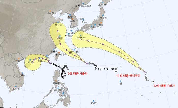 [ÇѶóÀϺ¸] µ¿½Ã ºÏ»ó ÁßÀÎ Á¦11È£ ÅÂdz 'ÇÏÀÌÄíÀÌ'¿Í Á¦12È£ ÅÂdz '±â·¯±â'°¡ ¾îµð·Î ÇâÇÒÁö °ü½ÉÀÌ ¸ð¾ÆÁö°í ÀÖ´Ù.