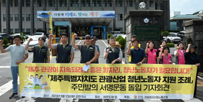 ¹ÎÁÖ³ëÃÑ ¼ºñ½º¿¬¸Í °ü±¤·¹Àú»ê¾÷³ëµ¿Á¶ÇÕÀº 12ÀÏ Á¦ÁÖµµÃ» ¾Õ¿¡¼ ±âÀÚȸ°ßÀ» ¿°í "Á¦ÁÖ°ü±¤ÀÌ Áö¼ÓµÇ·Á¸é ÁÁÀº ÀÏÀÚ¸®, û³â³ëµ¿ÀÚ°¡ ÇÊ¿äÇÏ´Ù"¸ç "°ü±¤»ê¾÷ û³â³ëµ¿ÀÚÀÇ ±Ç¸® º¸È£¿Í ÁõÁøÀ» À§ÇØ 'Á¦ÁÖÆ¯º°ÀÚÄ¡µµ °ü±¤»ê¾÷ û³â³ëµ¿ÀÚ Áö¿ø Á¶·Ê' Á¦Á¤À» À§ÇÑ ÁֹΠ¹ßÀÇ ¿îµ¿À» ½ÃÀÛÇÑ´Ù"°í ¹àÇû´Ù.