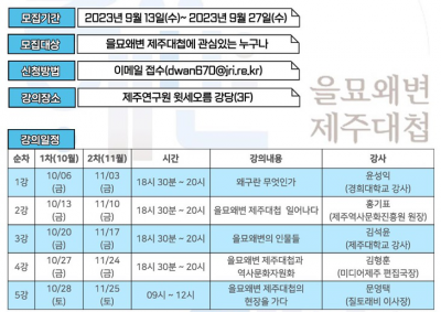°ÀÇ ÁÖÁ¦´Â '¿Ö±¸¶õ ¹«¾ùÀΰ¡', 'À»¹¦¿Öº¯ Á¦ÁÖ´ëø ÀϾ´Ù', 'À»¹¦¿Öº¯ÀÇ Àι°µé', 'À»¹¦¿Öº¯ Á¦ÁÖ´ëø°ú ¿ª»ç¹®ÈÀÚ¿øÈ', 'À»¹¦¿Öº¯ Á¦ÁÖ´ëøÀÇ ÇöÀåÀ» °¡´Ù'·Î Á¤ÇØÁ³´Ù. ¸ðÁý ÀοøÀº ¼±Âø¼ø 80¸íÀÌ´Ù. °ÀÇ ±³Àç´Â ±³À°Àå¿¡¼ ¹èºÎÇÑ´Ù. ¹®ÀÇ´Â ÀüÈ(729-0572)³ª e¸ÞÀÏ(dwan670@jri.re.kr)À» ÀÌ¿ëÇÏ¸é µÈ´Ù.