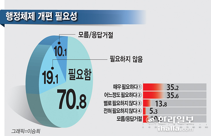 ¢ºÇàÁ¤Ã¼Á¦ °³Æí Çʿ伺=¿©·ÐÁ¶»ç¸¦ ÅëÇØ Á¦ÁÖµµ ÇàÁ¤Ã¼Á¦¿¡ ´ëÇÑ °³ÆíÀÌ ¾ó¸¶³ª ÇÊ¿äÇÏ´Ù°í »ý°¢ÇÏ´ÂÁö ¹¯´Â Áú¹®¿¡ ÀÀ´äÀÚÀÇ 70.8%°¡ 'ÇÊ¿äÇÏ´Ù'°í ´äÇß´Ù.