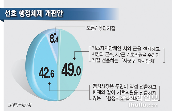 ÀÀ´äÀÚ Áß 49.0%´Â ±âÃÊÀÚÄ¡´ÜüÀÎ ½Ã¿Í ±ºÀ» ¼³Ä¡ÇÏ°í ½ÃÀå°ú ±º¼ö, ½Ã¡¤±º ±âÃÊÀÇ¿øÀ» ÁÖ¹ÎÀÌ Á÷Á¢ ¼±ÃâÇÏ´Â '½Ã±º±¸ ÀÚÄ¡´Üü'°¡ ¹Ù¶÷Á÷ÇÏ´Ù°í ´äÇß°í, 42.6%´Â ÇàÁ¤½ÃÀåÀº ÁÖ¹ÎÀÌ Á÷Á¢ ¼±ÃâÇϰí, ÇöÀç¿Í °°ÀÌ ±âÃÊÀÇ¿øÀ» ¼±ÃâÇÏÁö ¾Ê´Â 'ÇàÁ¤½ÃÀå Á÷¼±Á¦'¸¦ ¼±ÅÃÇß´Ù. ¸ð¸§¡¤ÀÀ´ä°ÅÀýÀº 8.4% ¿´´Ù.