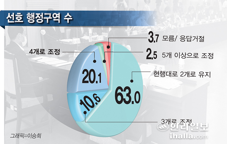 ¢º¼±È£ ÇàÁ¤±¸¿ª¼ö=Á¦ÁÖÀÚÄ¡µµ ÇàÁ¤±¸¿ª ¼³Ä¡ °³¼ö¿¡ ´ëÇØ¼´Â 'ÇöÇà´ë·Î 2°³·Î À¯ÁöÇÏ´Â °ÍÀÌ ÁÁ´Ù'´Â ÀÀ´äÀÌ 63.0%·Î °¡Àå ¸¹Àº ºñÀ²À» Â÷ÁöÇß´Ù.