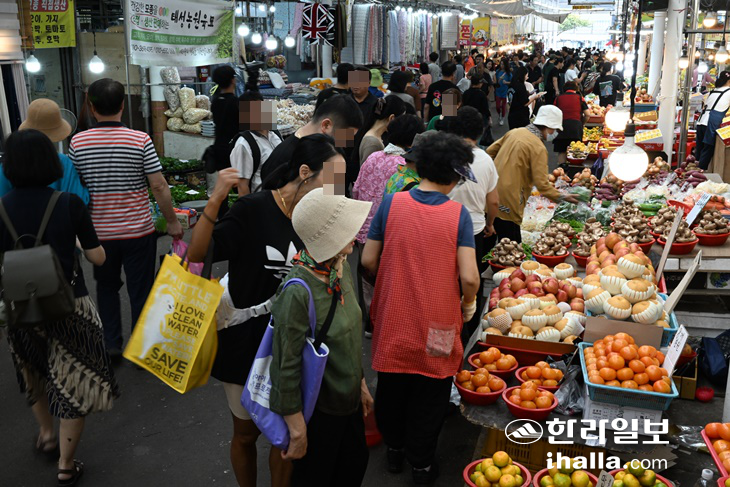 Á¦Áֽà µµµÎ1µ¿ ¹Î¼Ó¿ÀÀϽÃÀå¿¡´Â Ãß¼®À» ¾ÕµÎ°í ¿¸° ¸¶Áö¸· À峯ÀÎ ¸¸Å ¾ßä, °úÀÏ, »ý¼± µî Â÷·Ê»ó¿¡ ¿Ã¸± Á¦¼ö¿ëǰÀ» »ç·¯ ³ª¿Â ½Ã¹ÎµéÀÇ ¹ß±æÀÌ À̾îÁö°í ÀÖ¾ú´Ù. ´ë¸ñÀ¸·Î ²ÅÈ÷´Â Ãß¼®Àε¥ ³ôÀº ¹°°¡ µîÀ¸·Î ºÐÀ§±â°¡ ¿¹Àü °°Áö¸¸Àº ¾ÊÁö¸¸, ¿À·£¸¸¿¡ ºÏÀû°Å¸®´Â ¼Õ´Ôµé·Î ÀÎÇØ ºÐÁÖÇØÁø »óÀεéÀÇ ¾ó±¼¿¡´Â »ì¸ç½Ã ¹Ì¼Ò°¡ ¹øÁ³°í, ½ÃÀå Æ¯À¯ÀÇ Á¤°Ü¿î ÈïÁ¤ÀÌ ¿À°í °¡´Â ¼Ò¸®µµ °÷°÷¿¡¼ µé·Á¿Ô´Ù.