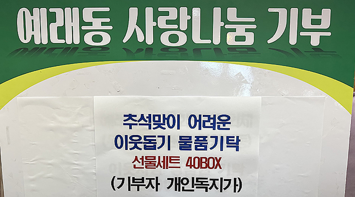 ¼±ÍÆ÷½Ã ¿¹·¡µ¿Áֹμ¾ÅÍ´Â Áö³´Þ 26ÀÏ À͸íÀÇ µ¶Áö°¡°¡ ¾î·Á¿î ÀÌ¿ôµé¿¡°Ô Àü´ÞÇØ ´Þ¶ó¸ç Ãß¼®¸ÂÀÌ ¼±¹° ¼¼Æ® 40¹Ú½º¸¦ ±âŹÇß´Ù°í ¹àÇû´Ù. ³ªÀÇ¿õ µ¿ÀåÀº "µû¶æÇÑ ¸¶À½À» ÀüÇØÁֽбâŹÀÚ¿¡°Ô °¨»çµå¸°´Ù"°í Çß´Ù.