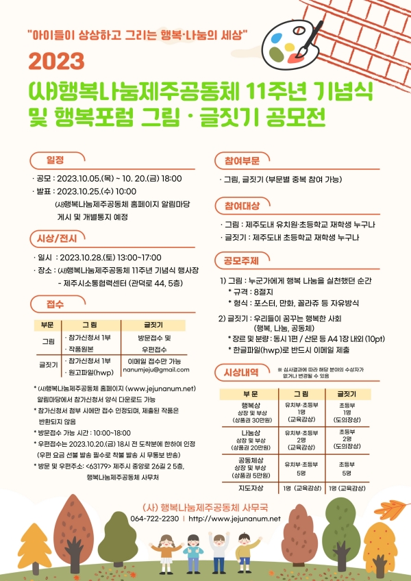 °ø¸ð ÁÖÁ¦´Â '¿ì¸®µéÀÌ ²Þ²Ù´Â ÇູÇÑ »çȸ'(±ÛÁþ±â), '´©±º°¡¿¡°Ô Çູ ³ª´®À» ½ÇõÇß´ø ¼ø°£'(±×¸²)ÀÌ´Ù. ±ÛÁþ±â´Â µ¿½Ã³ª »ê¹® µî À帣¸¦ ¼±ÅÃÇØ ÇÑ±ÛÆÄÀÏ·Î ÀÛ¼ºÇØ ¸ÞÀÏ·Î Á¦ÃâÇÏ¸é µÈ´Ù. ±×¸²Àº 8ÀýÁö ±Ô°Ý Á¾ÀÌ¿¡ Æ÷½ºÅÍ, ¸¸È µî ÀÚÀ¯·Î¿î Çü½ÄÀ¸·Î ±×·Á (»ç)Çູ³ª´®Á¦ÁÖ°øµ¿Ã¼(Á¦Áֽà Áß¾Ó·Î) »ç¹«Ã³¿¡ ¹æ¹® ¶Ç´Â ¿ìÆíÀ¸·Î Á¢¼öÇØ¾ß ÇÑ´Ù. µÎ ºÎ¹® ¸ðµÎ Âü°¡½Åû¼¸¦ ¹Ýµå½Ã ÀÛ¼ºÇØ ÇÔ²² ³»¾ß ÇÑ´Ù. ½Åû¼´Â Çູ³ª´®Á¦ÁÖ°øµ¿Ã¼ ȨÆäÀÌÁö '¾Ë¸²¸¶´ç- °øÁö»çÇ×'¿¡¼ ³»·Á¹ÞÀ» ¼ö ÀÖ´Ù.