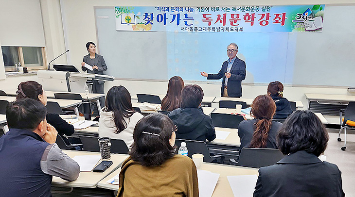 »õ¸¶À»¹®°íÁ¦ÁÖÆ¯º°ÀÚÄ¡µµÁöºÎ(ȸÀå À¯Ã¶¼ö)´Â Áö³ 17ÀÏ Á¦ÁÖ´ëÇб³¹Ì·¡À¶ÇÕ´ëÇп¡¼ ½Ç¹öÄɾÁöÇаú Çлý 30¸íÀÌ Âü¼®ÇÑ °¡¿îµ¥ ¾ç¿µ±æ ¹®Çйڻ縦 °»ç·Î ÃÊÃ»ÇØ 'ã¾Æ°¡´Â µ¶¼¹®ÇаÁÂ'¸¦ ½Ç½ÃÇß´Ù.