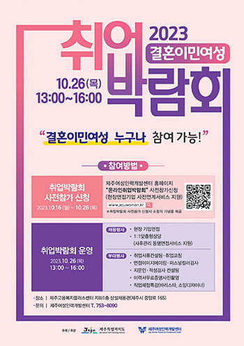 Á¦ÁÖ¿©¼ºÀη°³¹ß¼¾ÅÍ(°üÀå ±èÈñÁ¤)´Â Á¦ÁÖÆ¯º°ÀÚÄ¡µµ Áö¿øÀ¸·Î '2023³â °áÈ¥À̹ο©¼º Ãë¾÷¹Ú¶÷ȸ'¸¦ ¿À´Â 26ÀÏ °³ÃÖÇÑ´Ù°í ¹àÇû´Ù.