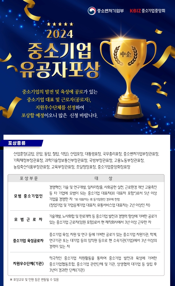 Áß¼Ò±â¾÷ À¯°øÀÚ Æ÷»óÀº ¢¹¸ð¹ü Áß¼Ò±â¾÷ÀÎ(Á¦Á¶, À¯Å롤¼ºñ½º) ¢¹¸ð¹ü ±Ù·ÎÀÚ ¢¹Áß¼Ò±â¾÷ À°¼º°ø·ÎÀÚ ¢¹Áö¿ø¿ì¼ö´Üü(±â°ü) µî 4°³ ºÎ¹®À¸·Î ³ª´² ½ÅûÀ» ¹Þ´Â´Ù. ½É»ç¸¦ ÅëÇØ »ê¾÷ÈÆÀå(±Ý¡¤Àº¡¤µ¿¡¤Ã¶¡¤¼®Å¾), »ê¾÷Æ÷Àå, ´ëÅë·Éǥâ, ±¹¹«ÃѸ®Ç¥Ã¢ µî Á¤ºÎÆ÷»ó°ú ±â°üǥâ(Áß¼Òº¥Ã³±â¾÷ºÎÀå°ü, Á¶´ÞûÀå µî)À» ¼ö¿©ÇÑ´Ù.